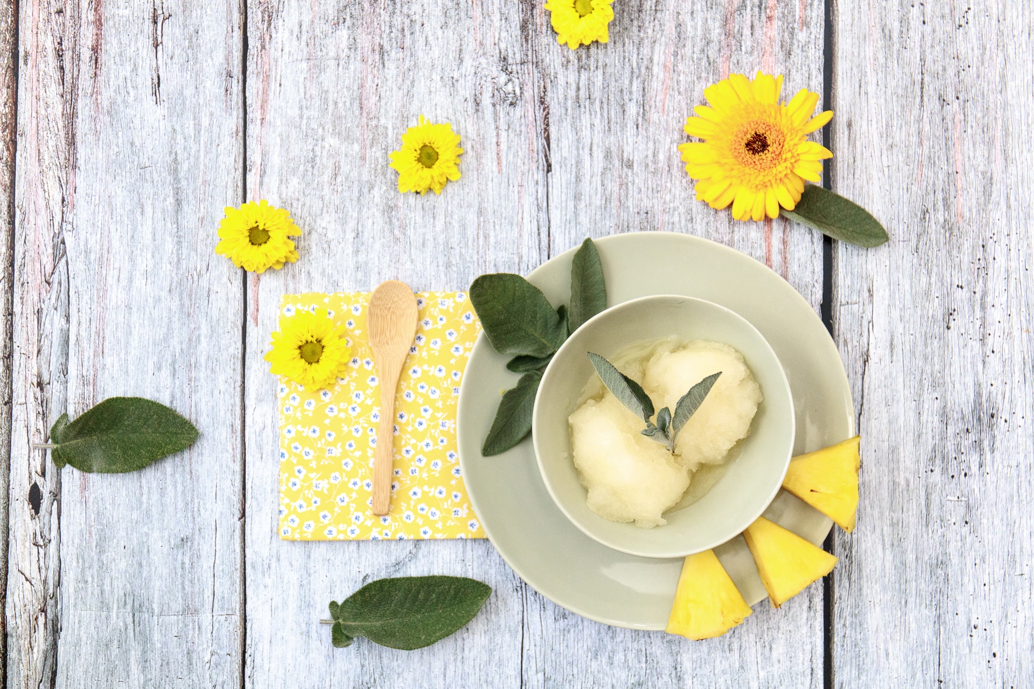 Da abbinare alla nostra granita super veloce abbiamo affettato un ananas fresco, che si può aggiungere direttamente a tocchetti piccoli nella granita, oppure accanto, da addentare fra un cucchiaino e l’altro.