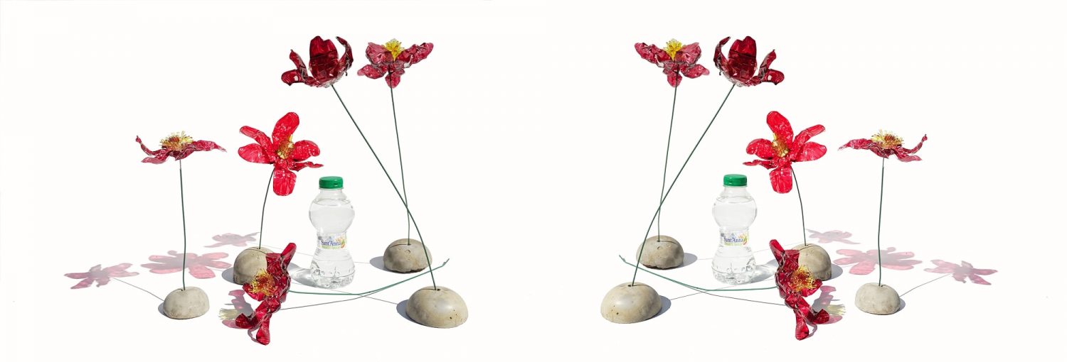 Abbiamo usato la vernice da vetro, per rispettare la trasparenza della plastica; giallo per il pistillo e rosso per i petali.